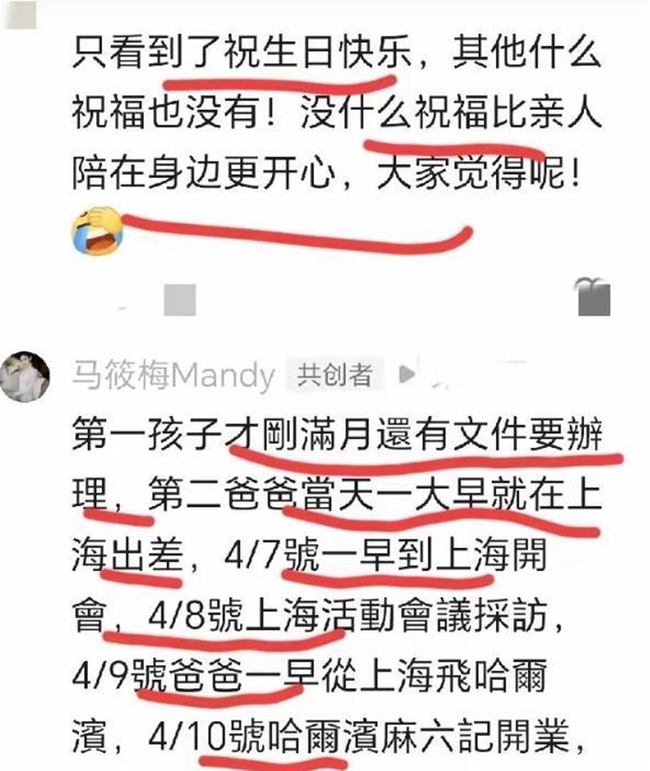 儿媳马筱梅的祝福方式则引发了更大的争议。 当天下午,她用她和汪小菲刚出生43天的儿子“汪宝”的账号,更新了一段短视频。 画面里新生儿脸蛋胖嘟嘟的,但祝福文案大部分内容是在回应外界的各种质疑,对婆婆生日的祝福显得轻描淡写,被全网指“翻车”,缺乏诚意。 有网友发现,她只提了自家热闹,却没替玥儿和箖箖向奶奶张兰问好。 最终,唯一记得张兰生日并送上鲜花和手写卡片的,竟是她公司的一名普通员工。