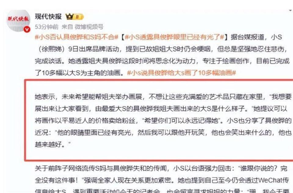 而小S这边,似乎也并未消停。 2026年4月9日,在消失一年后,小S复出出席一个美妆品牌代言活动。 她身穿白色洋装,一上台就大声说:“我心情非常好,我整个人都在发亮。 ”她透露,姐夫具俊晔现在大部分时间都待在家里,非常专注于画画,而他画的主题永远只有一个,就是大S。 从最初的素描到现在画油画,具俊晔已经画了超过250幅妻子的画像。 小S看过这些画,她说画得“栩栩如生,眼神跟灵魂都画出来了”。